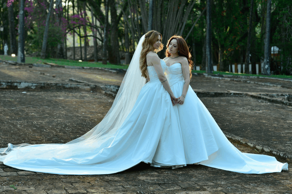 O cenário escolhido para o “sim” foi a Fazenda Santa Bárbara, onde as noivas trocaram votos ao ar livre. A decoração minimalista, mas sofisticada, contou com uma profusão de flores brancas, arcos florais na entrada e um bolo de cinco andares com as iniciais do casal, criando um ambiente de conto de fadas.